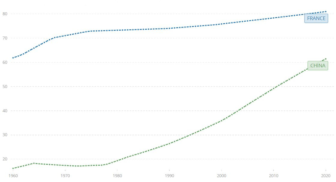 Comparaison des taux d’urbanisation de la France et de la Chine. Notez la progression spectaculaire de l’Empire du Milieu, dont le taux d’urbanisation au début des années 80 n’était que de 20%. La France disposait d’un taux d’urbanisation comparable… au début du XVIIIe siècle. Du point de vue de l’occupation du territoire, la Chine est passée en quarante ans de l’Ancien Régime aux Trente Glorieuses. Anecdote: le grand nombre d’accidents de la route en Chine vient notamment du fait qu’il s’agit de la premiere génération de Chinois à disposer d’une automobile.