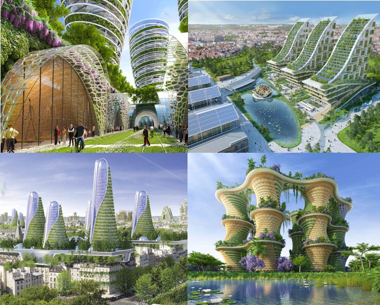 Les villes du futur telles qu’imaginées par nos urbanistes. Notez la courbure des immeubles, l’absence de formations anguleuses pour une plus grande ressemblance avec les organismes naturels, la présence de lacs. On est plus proche du récif corallien que du HLM. La surabondance de végétation fait ressembler ces maisons à de gigantesques serres ou des jardins suspendus.